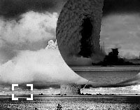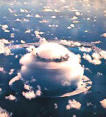 "At 20 miles it gave us no sound or flash or shock wave... Then, suddenly, we saw it – a huge column of clouds, dense, white, boiling up through the strato-cumulus, looking much like any other thunderhead but climbing as no storm cloud ever cloud. The evil mushrooming head soon began to blossom out. It climbed rapidly to 30,000 to 40,000 feet, growing a tawny-pink from oxides of nitrogen, and seemed to be reaching out in an expanding umbrella overhead .... For minutes the cloud stood solid and impressive, like some gigantic monument over Bikini. Then finally the shearing of the winds at different altitudes began to tear it up into a weird zigzag pattern."