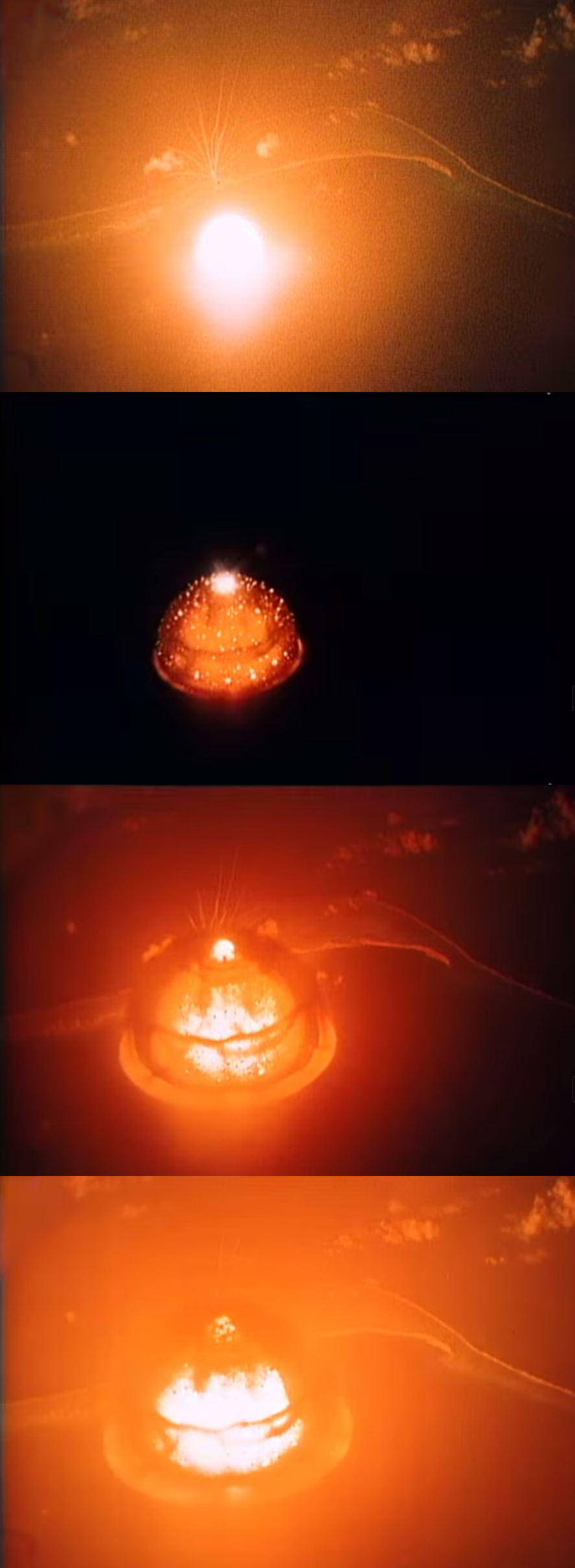 An interesting phenomenon can be seen during shots Romeo and Nectar of Operation Castle, Apache Navajo and Tewa of Operation Redwing, and shot Poplar of Operation Hardtack. A pimple or complete miniature fireball is ejected from the top of the main fireball. All the test shots that exhibited this phenomenon were over 100 kilotons, and fired from floating barges. Barges were used extensively during the Pacific testing from 1954 through to 1958 due to the diminishing remaining land mass.