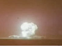 stage design. This was the second test of this design, the earlier 'clean' version tested in Redwing Zuni. The fission yield was 87%, the highest known fission yield in any U.S. thermonuclear test. A uranium tamper was used around the tertiary stage instead of the lead tamper used in Zuni. This design was later developed into the Mk-41 bomb, the highest yield weapon ever deployed by the U.S. The crater 1.2km wide and 39m deep. The cloud reached 31km, fallout from the shot blanketed an area of 3,200 square kilometers. clip used by kind permission of Atomcentral.com.