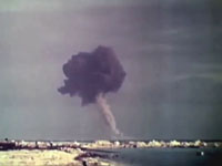 The largest atmospheric test conducted in the continental U.S. A test of a two-stage thermonuclear device designed by UCRL (University of California Radiation Laboratory), even though the U.S. government stated at the time that no thermonuclear tests were being conducted in Nevada. It used a boosted Swan primary (which gave yields of 12-19 kt in other tests during Plumbbob). About 7 kt of the overall yield was from fusion. The test also included troop maneuvers by 2500 Marines, and air operations by 124 aircraft. Clip used by kind permission of Atomcentral.com.
